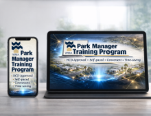 The initial 6-hour training course is offered online to both members and non-members and meets HCD Park Manager Training Program requirements. Completion of this course ensures that each mobilehome park or recreational vehicle park has at least one certified and properly trained park manager, as required by state regulations.